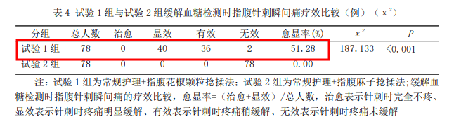 来源:《指腹花椒颗粒捻揉法对糖尿病患者针刺采血疼痛的干预研究》