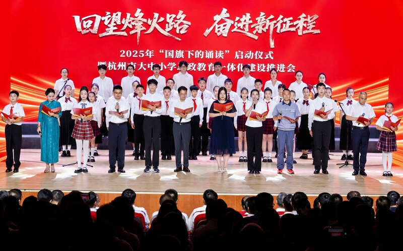 据悉,杭州市教育系统已连续4年开展“国旗下的诵读”主题宣传活动,今天现场还同步召开杭州市大中小学思政教育一体化建设推进会,将时代主题、校园文化与思政教育紧密结合,引领广大青少年传承红色基因、厚植爱国情怀。