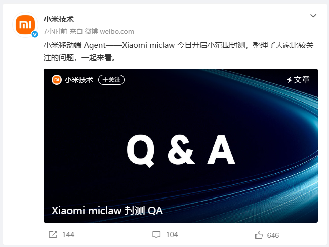 当各家都还在云端布局“龙虾”时,小米率先将战场转移到了移动端。