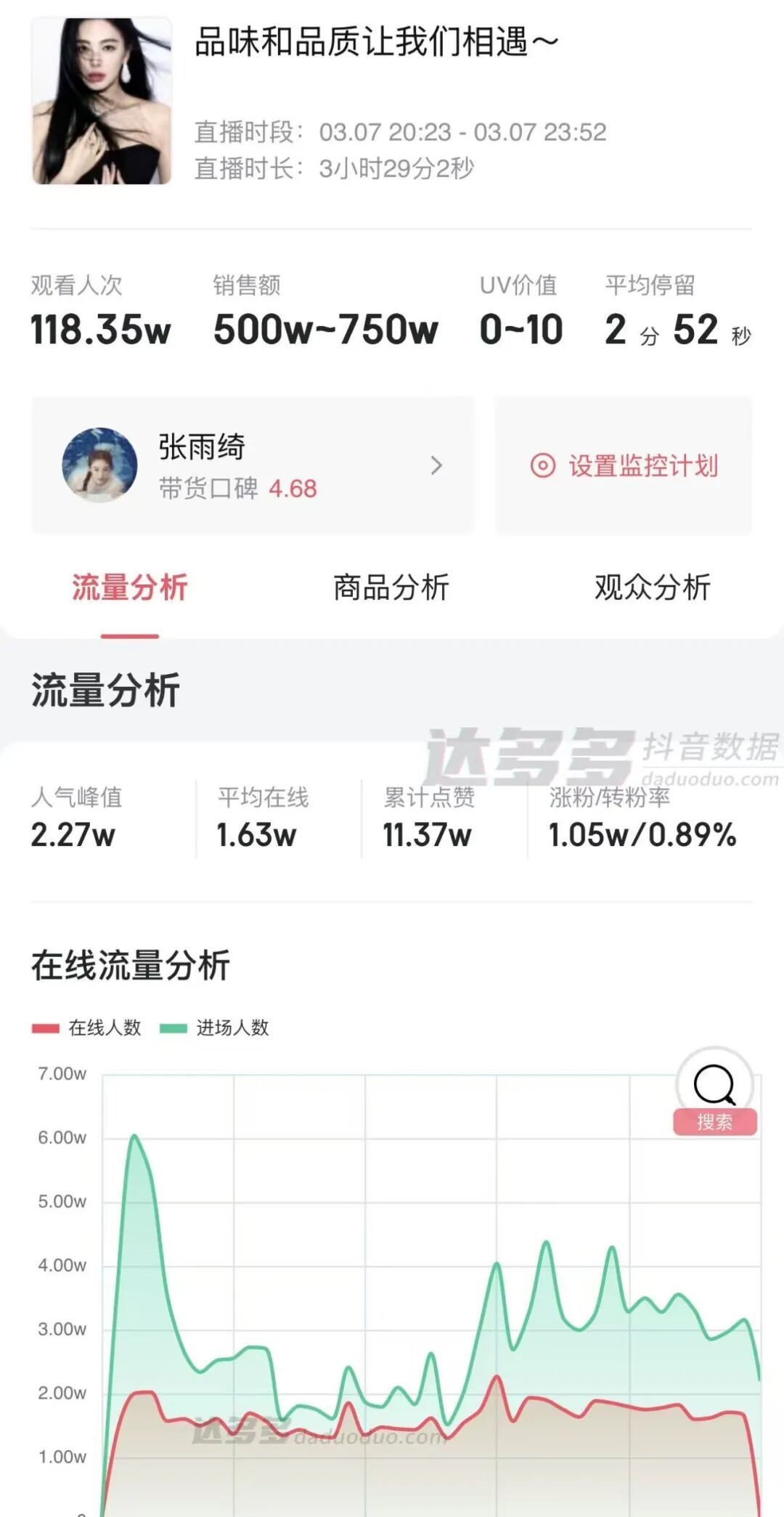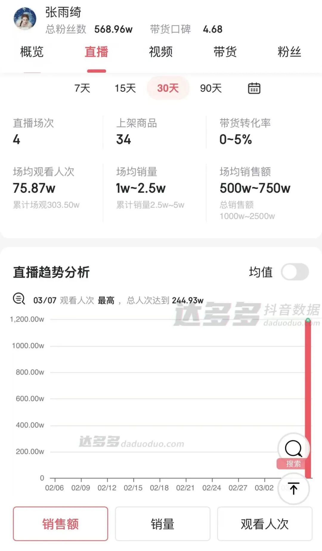 进入3月份,张雨绮总共直播了4场,之前两场没有直播带货,3月7日进行了两场直播带货,一天总共直播了7个多小时,直播带货销售额还挺稳定的。
