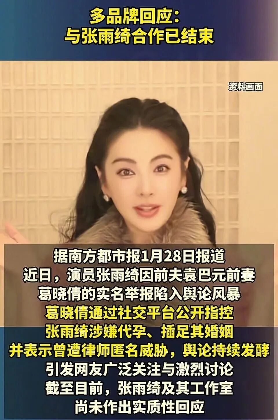 2026年1月,前夫袁巴元前妻葛晓倩实名举报其涉嫌违法代孕(双胞胎出生日期仅隔85天,违背自然妊娠周期)及插足婚姻,并公布监控录像、代孕合同等公证材料,但张雨绮方始终未出示出生证明或产检记录自证。