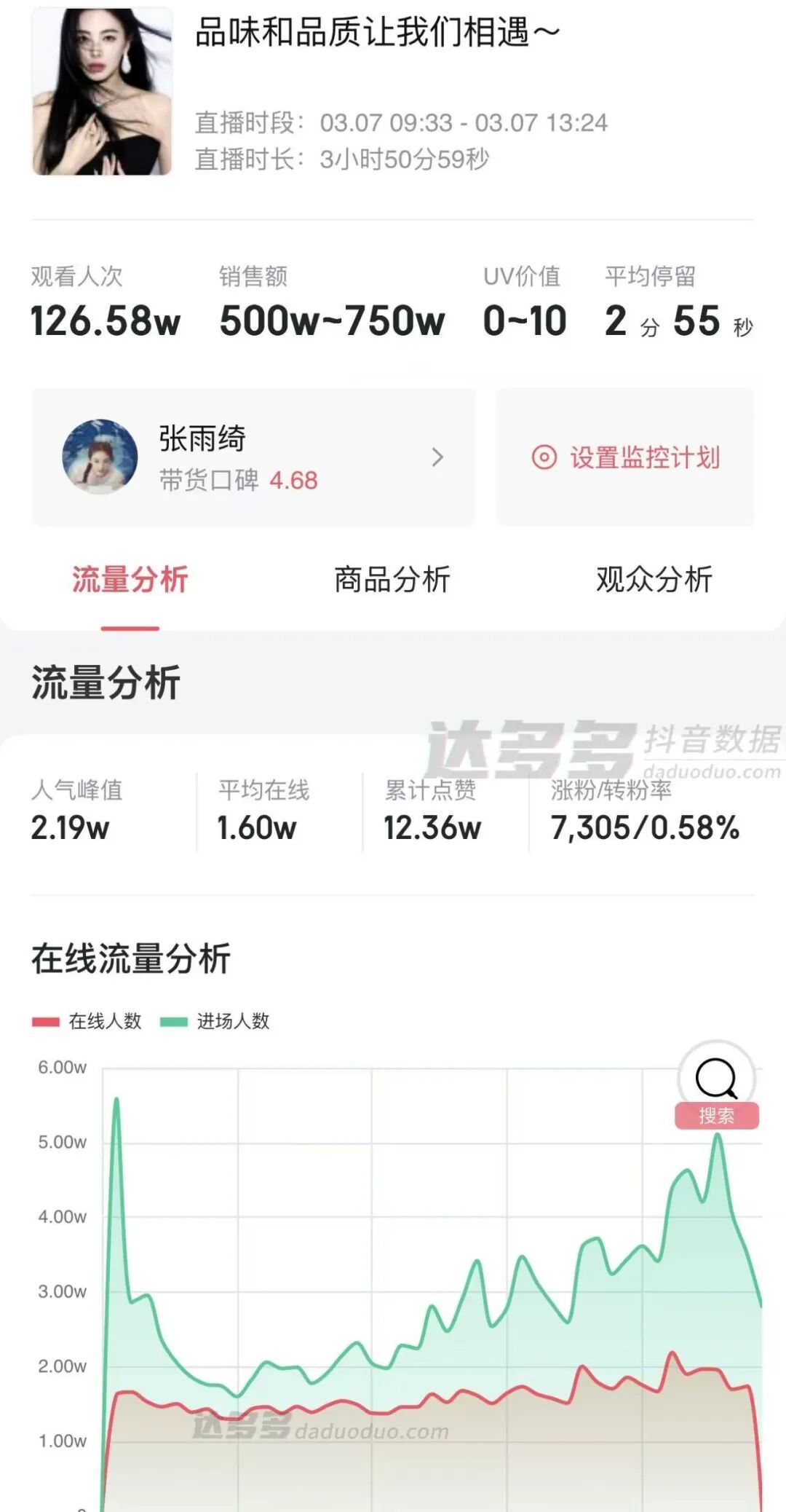 查看其3月7日的两场具体直播带货的数据显示,上午场直播带货,用时3小时50分钟,有超过126万人观看,卖货500万-750万,平均在线1.6万人,最高在线2.19万人。
